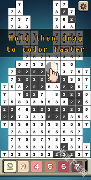 4、对于大面积的涂色,可以先点击颜色,再长按点击数字格子,滑动范围,就可以快速给滑到的区域上色。